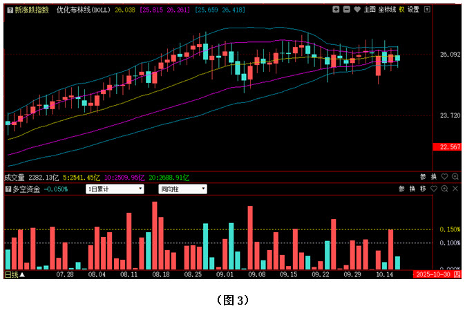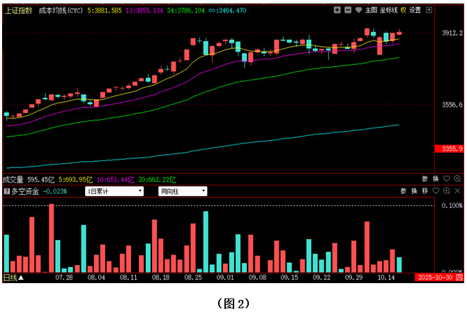 再看图2,今日大盘完全运行在5日成本均线上方,并小幅收阳。虽然目前指数还没有超越10月9日的3936高点,但距离创出新高仅一步之遥,可见市场短期走势仍处于强势格局当中,接下来只要多方继续发力,行情有望向上形成突破,为后市打开进一步上涨的空间。从下方的多空资金来看,今日多空资金为流出状态,虽然资金流出量小于昨日的资金流入量,但在这种关键位置,资金未能连续进场,说明面对前期高点,多方仍较为犹豫。所以接下来行情或仍有反复的可能。建议大家在控制好仓位,同时认真甄别手中个股情况,若手中个股前期涨幅较大,而近期不仅资金连续流出,且股价连续运行在5日成本均线下方,则需及时逢高减仓,以便规避风险的进一步扩大。