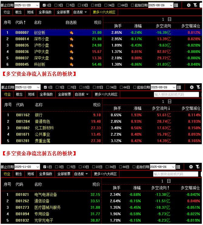 从板块资金动向数据来看,截止到今日午间收盘时,在资金流入榜上,银行板块以51.61亿的资金流入额位居榜首;其次是普通有色板块,资金流入20.74亿;此外,化工新材料板块、公共事业板块、贵重金属板块也都相继上榜,三个板块的资金流入额分别为17.63亿、15.78亿、14.39亿;再看资金流出榜,电气电源设备板块引领做空,资金流出13.38亿;其次是通信设备板块,资金流出11.51亿;此外,医疗器械与服务板块、专用设备板块、光学光电子板块的资金流出额也都相对较多,分列资金流出榜第三到第五名位置。综合比较后可知,今日上午虽然银行板块资金流入超过50亿,同时普通有色板块的资金流入额也在20亿之上,对稳定大盘起到了积极作用,但前期热门的科技类板块依然没有回归到资金流入榜前列,场内多方人气难以大幅提升;反观空方阵营,只有电气电源设备、通信设备、以及医疗器械与服务三个板块资金流出超过10亿,整体抛压较昨日明显减弱。可见今日上午虽然多方力量看似强于空方,在市场短期走势偏弱的情况下,多数投资者依然选择了观望,所以行情尚未出现有力反弹。不过随着场内抛压的减弱,多方发动反击的可能性正在逐渐增大。建议仓位较轻的投资者可关注近期调整过程中股价虽有回落但资金却在逆势加仓的个股,逢低介入。