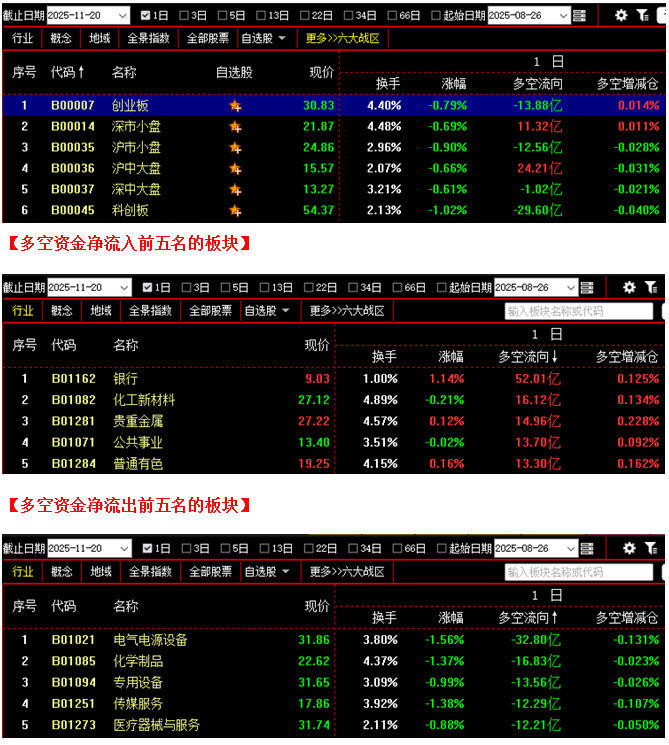 从板块资金动向数据来看,截止到今日收盘时,在资金流入榜上,银行板块以52.01亿的资金流入额位居榜首;其次是化工新材料板块,资金流入16.12亿;此外,贵重金属板块、公共事业板块、普通有色板块也都相继上榜,三个板块的资金流入额分别为14.96亿、13.70亿、13.30亿;再看资金流出榜,电气电源设备板块引领做空,资金流出32.80亿;其次是化学制品板块,资金流出16.83亿;此外,专用设备板块、传媒服务板块、医疗器械与服务板块的资金流出额也都相对较多,分列资金流出榜第三到第五名位置。综合比较后可知,今日虽然银行板块资金流入超过50亿,对稳定大盘起到一定作用,但其他板块的做多力量依然偏弱,尤其是前期热门的科技类板块,更是迟迟无法回归到资金流入榜前列,导致多方人气难以快速提升;反观空方阵营,除电气电源设备板块资金流出超过30亿之外,化学制品、专用设备、传媒服务、医疗器械与服务等板块的资金流出额也都在10亿之上,场内抛压依然较大。从六大战区的情况分别来看,截止到今日收盘时,只有深市小盘战区与沪中大盘战区为资金流入状态,其中深市小盘战区资金流入11亿,沪中大盘战区资金流入24亿;其余四个战区则均为资金流出,且科创板战区的资金流出额就接近30亿。可见今日资金还是以流出为主,多方力量仍弱于空方,加之抛压主要集中在中小盘个股之上,导致很多投资者短线被套幅度进一步加大,场内做多热情快速下降。在这种情况下,若接下来多方依然迟迟无法组织起有力反击,行情很可能会出现继续下探的动作。建议大家控制好仓位,同时密切关注场内多空资金的进出情况,在多方资金尚未连续回流之前,不要急于重仓抄底。