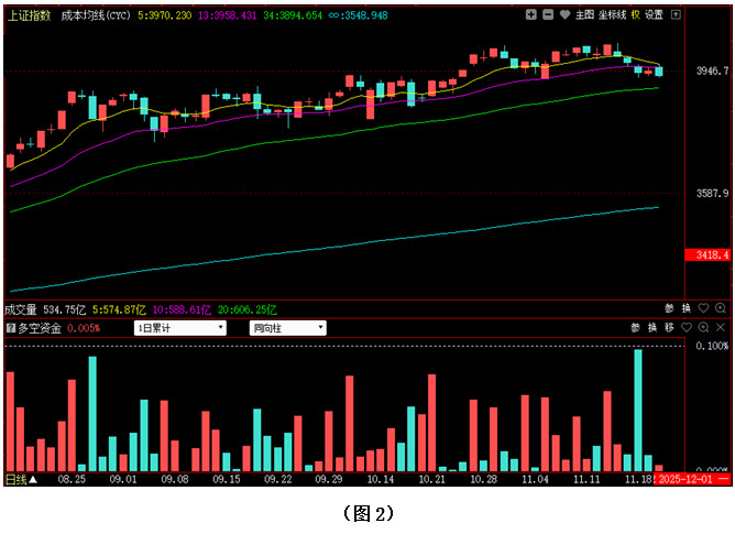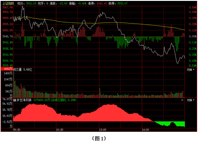 如图1所示,今日早间大盘高开,并试图上攻,但指数很快就在3960点上方遇阻,市场先是回落到3950点附近震荡整理,11点后再度向上发起冲击,可惜大盘依然是在3960点上方遇阻,难以进一步向上回升,在多方两次尝试均告失败后,指数开始继续下探,最终以3931点收盘。从下方的多空资金来看,早间开盘后,多方率先占据优势,但资金进场的持续性依然不强,午后随着大盘不断向下回落,资金更是由红翻绿。可见今日多方虽试图向上反击,但资金进场并不坚决,所以才导致两次上攻均遇阻回落。在这种情况下,如果空方持续施压,行情很可能会出现进一步下探的动作。建议大家控制好仓位,谨慎操作。