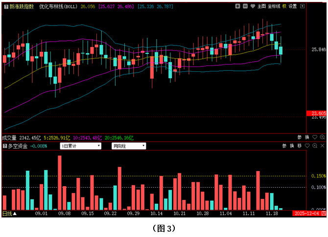今日两市上涨个股共1453只,其中涨幅超过3%的个股250只,涨幅在9.9%以上的个股49只;下跌个股共3850只,其中跌幅超过3%的个股573只,跌幅在9.9%以上的个股17只。图3所示为指南针特有的0Z指数K线图,从图中可以看到,今日0Z指数高开低走,继续收阴,收盘位置已回落到优化布林下紫线附近。可见今日场内多数个股都出现了持续调整,市场整体走势进一步转弱,接下来若多方依然无法及时反击,0Z指数很可能会下探到优化布林下轨附近去寻求支撑。从下方的多空资金来看,今日多空资金为流出状态,且资金流出量继续减少,说明场内抛压已有逐步减弱的迹象。在这种情况下,如果多方能够及时发力,个股有可能会迎来一次大面积反弹。建议仓位较轻的投资者可关注近期调整过程中股价虽有回落但资金却在逆势加仓的个股,逢低介入。