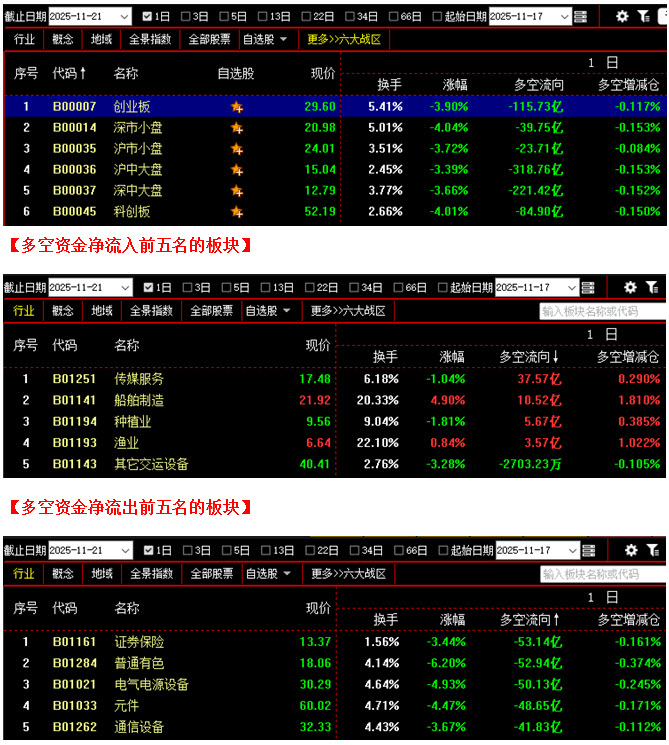 从板块资金动向数据来看,截止到今日收盘时,在资金流入榜上,传媒服务板块以37.57亿的资金流入额位居榜首;其次是船舶制造板块,资金流入10.52亿;此外,种植业板块、渔业板块的资金流入额也都相对较多,分列资金流入榜第三与第四名位置;再看资金流出榜,证券保险板块引领做空,资金流出53.14亿;其次是普通有色板块,资金流出52.94亿;此外,电气电源设备板块、元件板块、通信设备板块也都相继上榜,三个板块的资金流出额分别为50.13亿、48.65亿、41.83亿。综合比较后可知,今日不仅证券保险板块资金流出高达53亿,对大盘形成压制作用,普通有色、电气电源设备、元件、通信设备等板块的资金流出额也都在40亿之上,场内抛压明显增强,恐慌性抛盘大量涌出,全天资金流出超过10亿的板块多达29个;反观多方阵营,虽然传媒服务板块资金流入达到37亿,但全天只有四个板块为资金流入状态,多方显然难以组织起有力反击。从六大战区的情况分别来看,截止到今日收盘时,六个战区均为资金流出状态,其中创业板战区资金流出115亿,深中大盘战区资金流出221亿,沪中大盘战区的资金流出额更是高达318亿。可见今日空方全面施压,各战区均有资金大幅出逃,说明随着大盘加速下滑,不少投资者的做多信心已开始出现崩塌,恐慌性抛盘大量涌出,而多方几乎毫无反击之力。在这种情况下,行情短期内很可能会有继续下探的动作。建议大家控制好仓位,不要急于重仓抄底,可待市场逐步企稳后,再优选个股,从容介入。