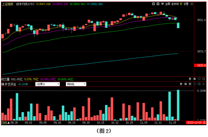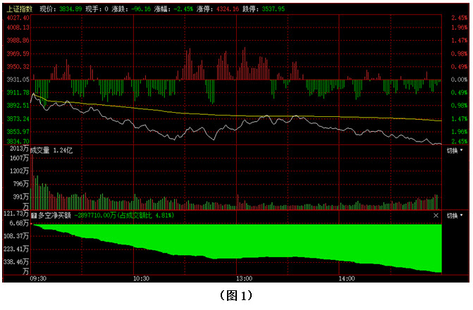 如图1所示,今日早间大盘直接低开在3900点下方,并一路下探,直到3840点附近市场才获得支撑,但指数反弹幅度不大,大盘尚未回升到3880点上方就遇到阻力,难以继续上行,下午1点半后,指数再次逐步下探,最终以3834点收盘。从下方的多空资金来看,早间开盘后不久,空方就占据优势,随后资金持续流出,而指数在盘中向上反弹过程中,资金并未出现快速回流。可见今日空方力量远远强于多方,具备着压倒性优势。在这种情况下,即便是多方主力,也不敢冒然进场。所以空方的动能还会有进一步释放的过程,这也正是行情会形成惯性下探的原因。建议大家控制好仓位,谨慎操作。