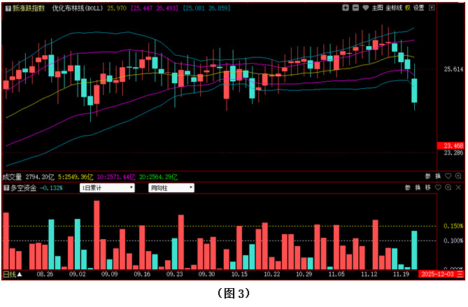 今日两市上涨个股共354只,其中涨幅超过3%的个股111只,涨幅在9.9%以上的个股34只;下跌个股共5072只,其中跌幅超过3%的个股3661只,跌幅在9.9%以上的个股119只。图3所示为指南针特有的0Z指数K线图,从图中可以看到,今日0Z指数同样低开低走,大幅下挫,收盘位置已回落到优化布林下轨下方。可见今日场内多数个股不仅出现了持续杀跌,而且下跌的幅度也明显增大,市场整体走势进一步转弱。从下方的多空资金来看,今日多空资金为流出状态,且资金流出量较昨日大幅增多,说明随着恐慌性抛盘的大量涌出,原本已经逐渐衰减的空方动能得到快速增强。经过连续四天的回落,目前0Z指数已经回到8月26日之后震荡区间的下沿位置,该位置若直接失守,则意味着近三个月进场加仓的资金将全面被套。所以多方很可能会在此进行反击,但需要注意的是,只要0Z指数无法站回到优化布林中轨之上,市场的回升就只能当做反弹去看,而不能作为新一轮行情的开始。建议大家控制好仓位,快进快出,谨慎操作。