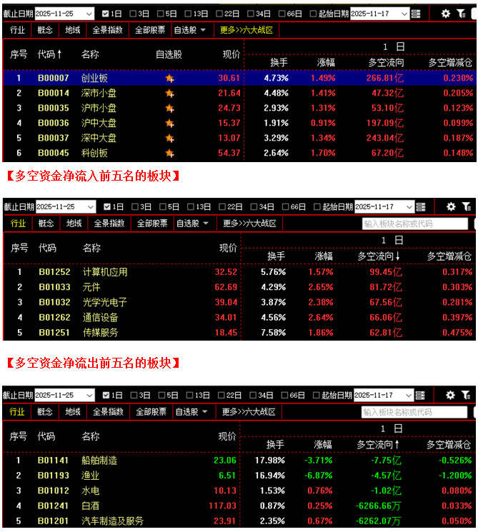 从板块资金动向数据来看,截止到今日收盘时,在资金流入榜上,计算机应用板块以99.45亿的资金流入额位居榜首;其次是元件板块,资金流入81.72亿;此外,光学光电子板块、通信设备板块、传媒服务板块也都相继上榜,三个板块的资金流入额分别为67.56亿、66.06亿、62.81亿;再看资金流出榜,船舶制造板块引领做空,资金流出7.75亿;其次是渔业板块,资金流出4.57亿;此外,水电板块、白酒板块、汽车制造及服务板块的资金流出额也都相对较多,分列资金流出榜第三到第五名位置。综合比较后可知,今日不仅计算机应用板块资金流入高达99亿,元件、光学光电子、通信设备、传媒服务等板块的资金流入额也都在60亿之上,科技类板块集体大幅做多,再度形成群体上攻效应,促使场内多方人气快速回升,全天资金流入超过10亿的板块多达21个;反观空方阵营,除船舶制造板块资金流出高于7亿之外,其余板块的资金流出额均不足5亿,整体抛压较轻。从六大战区的情况分别来看,截止到今日收盘时,六个战区均为资金流入状态,其中不仅沪中大盘战区资金流入接近200亿,创业板战区与深中大盘战区的资金流入额更是双双超过240亿。可见今日各战区均有资金大幅回流,多方继续全面反击,且力度明显增强,说明随着反弹的持续,场外资金开始纷纷进场加仓,投资者的做多热情快速提升。在这种情况下,行情在短期内或有再次向3900点整数关口发起冲击的可能。但需要注意的是,3900点附近,不仅有整数关口的压力,还有34日成本均线与5日成本均线的双重压制,所以如果多方后续力量不足,大盘将很难对该位置形成有效突破,届时一旦空方连续施压,市场很有可能会遇阻回落,甚至出现更大幅度的调整。故此建议大家此时不要盲目追涨,仍需控制好仓位,保持谨慎态度。