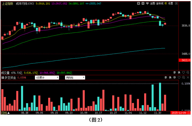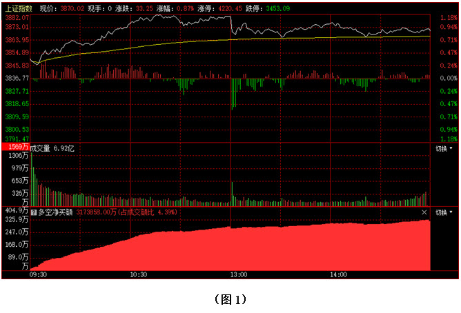 如图1所示,今日早间大盘高开后,指数一路震荡上行,直到3880点附近才遇到上方阻力,但市场并未出现明显回落,午后大盘围绕着3870点窄幅震荡整理,整体走势十分平稳,指数最终以3870点收盘。从下方的多空资金来看,早间开盘后,多方就占据优势,随后资金持续流入,即便是大盘在3880点附近遇阻之后,资金进场的力度也在逐渐增强。可见今日资金进场十分坚决,多方力量远远强于空方,说明随着大盘连续向上反弹,投资者的做多热情再度被点燃。在这种情况下,行情就有可能在资金的推动下继续向上回升。但要想彻底扭转市场短期的弱势状态,多方的后续力量还需进一步加强。建议大家控制好仓位,同时密切关注场内多空资金的进出情况,若遇到关键节点,多方资金却无法连续大幅回流,操作上则需谨慎。