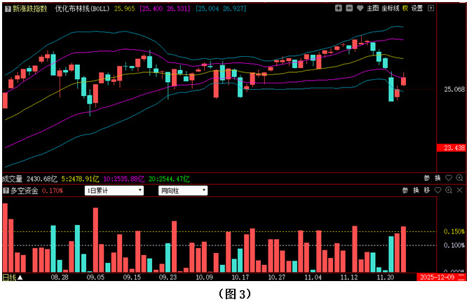 今日两市上涨个股共4300只,其中涨幅超过3%的个股753只,涨幅在9.9%以上的个股101只;下跌个股共993只,其中跌幅超过3%的个股68只,跌幅在9.9%以上的个股10只。图3所示为指南针特有的0Z指数K线图,从图中可以看到,今日0Z指数高开后继续向上反弹,再收一根阳线,收盘位置回升至优化布林下紫线附近。同时经过连续两天的反弹,上周五的阴线实体已被完全吞没。可见今日场内多数个股都出现连续回升,接下来0Z指数或将趁势回补掉上周五早间的向下跳空缺口,但只要0Z指数还没有重新站上优化布林中轨,市场整体走势就依然偏弱。从下方的多空资金来看,今日多空资金为流入状态,且资金流入量较昨日有所放大,说明多方后续力量依然较为充足,有利于行情继续向上反弹。建议大家在控制好仓位的同时,可关注近期有资金连续回流且股价短期趋势重新转强的优质个股,逢低适当参与。