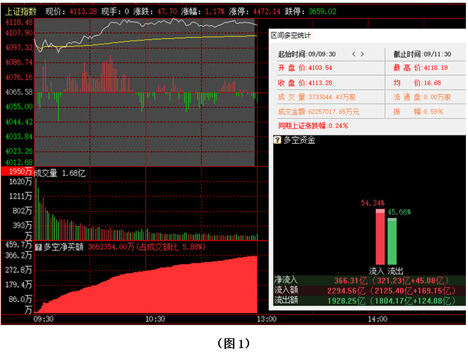 今日早间大盘直接高开在4100点上方,市场略作震荡后,继续向上回升,至中午收盘时,指数位于4113点。从日K线图上看,今天上午大盘不仅轻松跃过了4100点整数关口,同时也一举突破了5日成本均线与13日成本均线的双重压力,市场短期走势出现重新转强的迹象。从下方的多空资金来看,早间开盘后,多方就占据优势,随后资金持续流入。截止到中午收盘时,沪市当中多方力量高于空方超过8个百分点,资金流入360多亿。从六大战区的情况分别来看,截止到今日中午收盘时,六个战区均为资金流入状态,其中不仅沪中大盘战区与深中大盘战区资金流入双双超过195亿,创业板战区的资金流入额更是高达335亿。可见今日上午多方全面发力,各战区均有资金大幅进场加仓,抢筹迹象十分明显。在这种情况下,指数快速突破5日成本均线压制,市场短期走势出现重新转强迹象。由于资金进场力度极大,预计后市行情仍有进一步向上攀升的可能。建议大家紧跟资金步伐,积极优选个股,择机介入。