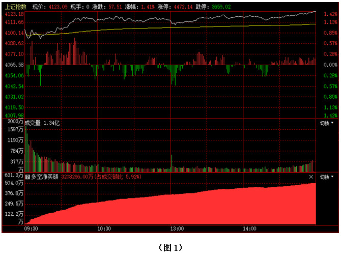 如图1所示,今日早间大盘直接高开在4100点上方,指数在4100点整数关口附近略作震荡后,继续向上攀升,但临近4120点时,上方压力有所显现,于是市场在4110点至4120点之间展开横向窄幅震荡整理,直到下午两点半后,大盘才向上冲破了4120点,最终以4123点收盘。从下方的多空资金来看,早间开盘后,多方就占据优势,随后资金持续流入,即便是指数横向窄幅震荡整理的过程中,资金进场的力度也仍在不断加强。可见今日资金进场极为坚决,多方力量远远强于空方,具备着压倒性优势,说明尽管近期大盘在4000点之上出现反复,但只要市场出现回升迹象,投资者的做多热情就会被快速点燃。在这种情况下,后市行情就有望在资金的推动下向前期高点发起挑战,一旦形成突破,后市上涨空间就将进一步打开。建议大家控制好仓位,同时关注近期有资金连续流入的板块,并在其中优选个股,逢低吸纳。