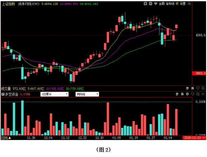 再看图2,今日大盘不仅以高开方式一举夺回5日与13日两条成本均线,而且指数还重新回到了4100点整数关口上方,市场短期走势出现重新转强的迹象。从下方的多空资金来看,今日多空资金为流入状态,且资金流入量较上周五明显放大,说明今日大盘高开之后资金不仅没有趁机逢高减仓,反而在积极进场抢筹。如此一来,市场的短期主动权就被多方牢牢掌控。接下来在春节长假前还有四个交易日,在这四个交易日当中,不必求快,只需求稳。因为只要大盘能够站稳在4100点上方,节后行情就有望依托着下方5日成本均线与13日成本均线的支撑继续向上攀升,甚至不排除指数有冲破4200点的可能。