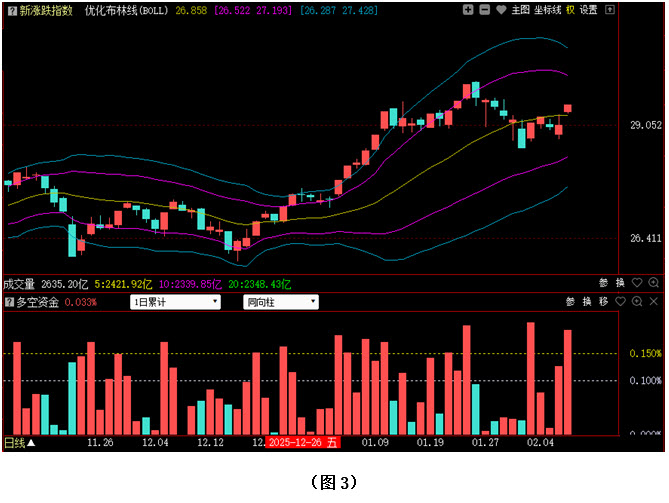 今日两市上涨个股共4372只,其中涨幅超过3%的个股977只,涨幅在9.9%以上的个股116只;下跌个股共717只,其中跌幅超过3%的个股69只,跌幅在9.9%以上的个股3只。图3所示为指南针特有的0Z指数K线图,从图中可以看到,今日0Z指数高开在优化布林中轨上方,并继续向上拉升,最终以阳线报收。可见今日场内多数个股都出现了上涨,市场整体走势出现转强迹象。从下方的多空资金来看,今日多空资金为流入状态,且资金流入量较上周五继续增加,说明多方资金不仅持续加仓,且进场力度越来越强。在这种情况下,行情就有了进一步上攻的动能,所以接下来0Z指数有望站稳在优化布林中轨上方,并继续向上拉升。