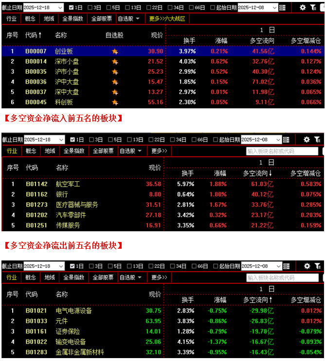 从板块资金动向数据来看,截止到今日收盘时,在资金流入榜上,航空军工板块以61.03亿的资金流入额位居榜首;其次是银行板块,资金流入40.12亿;此外,医疗器械与服务板块、汽车零部件板块、传媒服务板块也都相继上榜,三个板块的资金流入额分别为33.76亿、23.17亿、21.22亿;再看资金流出榜,电气电源设备板块引领做空,资金流出29.98亿;其次是元件板块,资金流出26.83亿;此外,证券保险板块、输变电设备板块、金属非金属新材料板块的资金流出额也都相对较多,分列资金流出榜第三到第五名位置。综合比较后可知,今日不仅银行板块资金流入超过40亿,对大盘上行起到推动作用,航空军工板块的资金流入额更是高达61亿,同时医疗器械与服务、汽车零部件、传媒服务等板块也都有资金积极进场加仓,场内多方人气继续维持在较高水平;反观空方阵营,电气电源设备板块与元件板块资金流出双双超过25亿,同时证券保险、输变电设备、金属非金属新材料板块的资金流出额也都在15亿之上,虽然整体上空方力量弱于多方,但抛压较昨日明显增强。从六大战区的情况分别来看,截止到今日收盘时,六个战区均为资金流入状态,其中不仅创业板战区与沪市小盘战区资金流入双双超过40亿,沪中大盘战区的资金流入额更是达到71亿。可见今日多方仍在全面发力,试图推动大盘进一步向上回升。但与昨日晚评数据相比就会发现,今日多数战区的资金流入额都出现了明显减少,说明面对上方重要阻力区,多方未能一鼓作气,快速突破,后续做多力量反而开始出现衰减迹象。在这种情况下,一旦多方力量继续减弱,空方趁机施压,行情很可能会在此遇阻,并再次出现下探动作。建议大家控制好仓位,谨慎操作。
