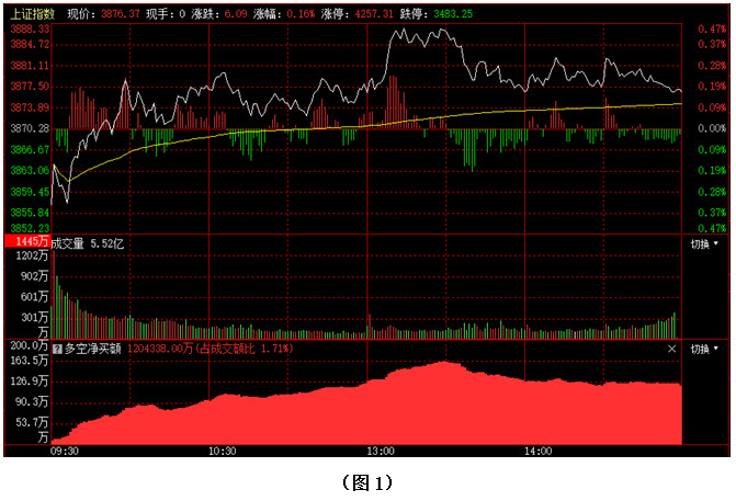 如图1所示,今日早间大盘低开,但指数并未趁势杀跌,而是很快回升至3870点上方,随后市场围绕着3875点展开窄幅震荡整理,午后大盘一度冲上3880点,并试图进一步向上攀升,但3900点附近依然存在强大阻力,以致指数尚未触及到3890点就调头回落,最终以3876点收盘。从下方的多空资金来看,早间开盘后,多方就占据优势,且资金持续流入,午后虽然大盘冲高回落,但资金却并未大幅流出。可见今日场外资金进场意愿依然较高,多方优势较为明显。但即便如此,大盘还是没有突破上方的密集阻力区,行情只得继续在3880点下方震荡整理。在这种情况下,随着震荡时间的延长,投资者的做多信心往往会逐步下降,届时一旦多方后续力量无法跟上,空方连续施压,市场很可能会再次下挫。建议大家可在控制好仓位的同时,密切关注多空资金的进出情况以及3900点一带的压力情况,若多方迟迟无法向上形成突破,且后续做多力量出现连续衰减,操作上则需格外谨慎。