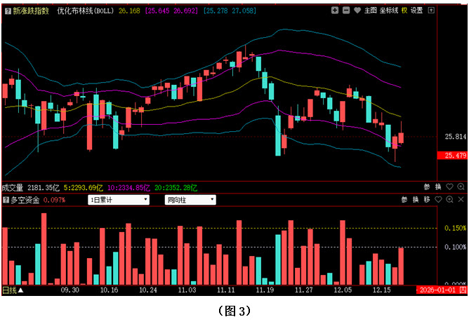 今日两市上涨个股共2845只,其中涨幅超过3%的个股407只,涨幅在9.9%以上的个股75只;下跌个股共2416只,其中跌幅超过3%的个股327只,跌幅在9.9%以上的个股8只。图3所示为指南针特有的0Z指数K线图,从图中可以看到,今日0Z指数同样低开回升,收出阳线,但即便连续两天收阳,仍未能将周二的阴线实体完全吞没。可见今日尽管场内多数个股都出现了连续回升,但能够将周二失地完全收复的却并不多,所以市场整体走势依然偏弱,若0Z指数在短期内仍无法回到优化布林中轨上方,后市很可能还会有进一步下探的动作。从下方的多空资金来看,今日多空资金为流入状态,且资金流入量较昨日明显增加,说明不少中小盘个股的资金回流力度出现增强,有利于投资者做多热情的进一步提升。在这种情况下,只要多方后续力量不断跟上,0Z指数就有望突破优化布林中轨压制,重新进入强势区域。故此建议大家在控制好仓位的同时,密切关注场内多空资金的进出情况,以便及时掌握行情变化,并做出相应决策。