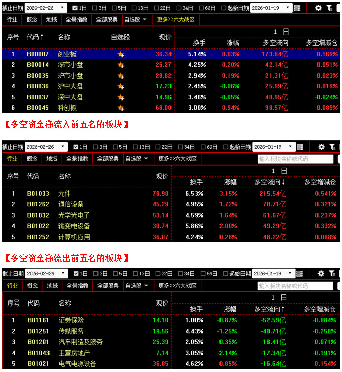 从板块资金动向数据来看,截止到今日收盘时,在资金流入榜上,元件板块以215.54亿的资金流入额位居榜首;其次是通信设备板块,资金流入78.71亿;此外,光学光电子板块、输变电设备板块、计算机应用板块也都相继上榜,三个板块的资金流入额分别为61.67亿、49.29亿、48.22亿;再看资金流出榜,证券保险板块引领做空,资金流出52.59亿;其次是传媒服务板块,资金流出40.71亿;此外,汽车制造及服务板块、主营房地产板块、电气电源设备板块的资金流出额也都相对较多,分列资金流出榜第三到第五名位置。综合比较后可知,今日不仅元件板块资金流入高达215亿,通信设备、光学光电子、输变电设备、计算机应用等板块的资金流入额也都在45亿之上,资金进场依然十分积极,多方人气继续维持在较高水平;反观空方阵营,除证券保险板块资金流出超过50亿之外,传媒服务、汽车制造及服务、主营房地产、电气电源设备等板块的资金流出额也都超过了15亿,虽然整体上多方力量仍强于空方,但与前两日相比,场内抛压已有增强迹象。从六大战区的情况分别来看,截止到今日收盘时,六个战区均为资金流入状态,其中不仅科创板战区资金流入接近百亿,创业板战区的资金流入额更是高达173亿。可见虽然今日既有资金大幅流入的板块,也有资金快速流出的板块,多空双方争夺十分激烈,导致市场中出现冰火两重天的现象,但整体上资金还是以流入为主,这就说明目前多数投资者对后市依然较为乐观,所以面对行情回探,场内并没有出现大规模的恐慌性抛盘,反而有资金在趁机逢低买入。在这种情况下,市场出现连续大幅杀跌的可能性相对较小,后市有望在资金的推动下继续震荡上行。建议大家在控制好仓位的同时,积极关注近期有资金连续流入且短期趋势保持向上的个股,逢低吸纳。