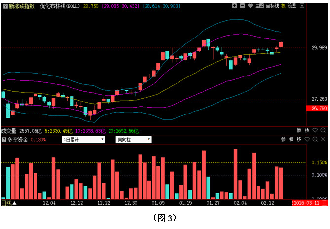 今日两市上涨个股共2394只,其中涨幅超过3%的个股583只,涨幅在9.9%以上的个股90只;下跌个股共2670只,其中跌幅超过3%的个股216只,跌幅在9.9%以上的个股5只。图3所示为指南针特有的0Z指数K线图,从图中可以看到,今日0Z指数并未跟随大盘出现回探,而是延续前两日的上攻走势,继续向上小幅攀升,再次收出阳线,收盘位置距离创出新高仅差一步之遥。可见今日场内多数个股的短期上行趋势保持良好,市场整体走势依然较强。从下方的多空资金来看,今日多空资金为流入状态,尽管资金流入量较昨日有所减少,但资金的持续流入说明多数投资者对后市依然较为看好。在这种情况下,即便行情有所反复,市场向下回探的空间也将十分有限,而一旦0Z指数创出新高,后市就有望向上展开进一步上攻。