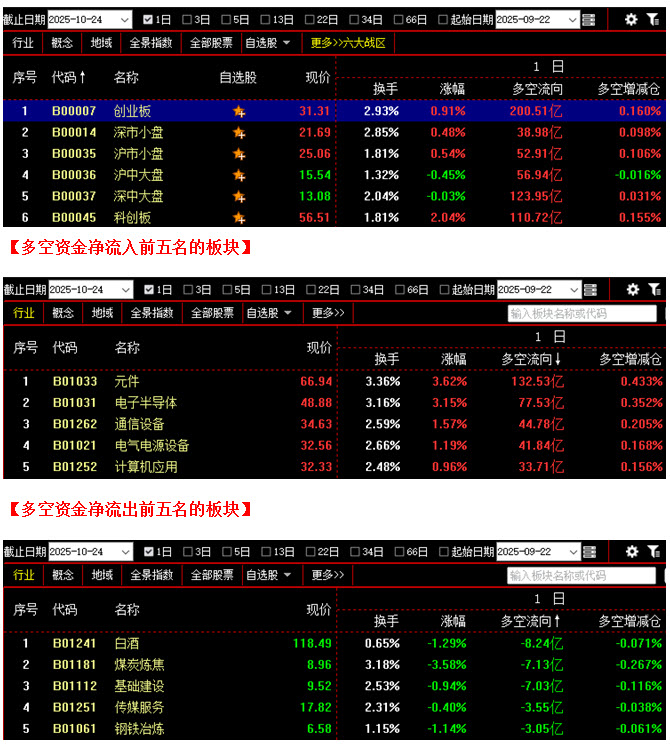 从板块资金动向数据来看,截止到今日午间收盘时,在资金流入榜上,元件板块以132.53亿的资金流入额位居榜首;其次是电子半导体板块,资金流入77.53亿;此外,通信设备板块、电气电源设备板块、计算机应用板块也都相继上榜,三个板块的资金流入额分别为44.78亿、41.84亿、33.71亿;再看资金流出榜,白酒板块引领做空,资金流出8.24亿;其次是煤炭炼焦板块,资金流出7.13亿;此外,基础建设板块、传媒服务板块、钢铁冶炼板块的资金流出额也都相对较多,分列资金流出榜第三到第五名位置。综合比较后可知,今日上午不仅元件板块资金流入高达132亿,而且电子半导体、通信设备、电气电源设备、计算机应用等板块的资金流入额也都在30亿之上,在昨日下午两点后,科技类板块就曾有异动迹象,今日集体做多更是令场内多方人气快速回升,仅半天时间,资金流入超过10亿的板块就达到14个;反观空方阵营,虽然白酒、煤炭、基建、钢铁等权重板块纷纷出现在资金流出榜前列,但各板块的资金流出额均不足9亿,整体抛压并不是很大。可见今日上午科技类板块集体发力,资金快速回流,多方力量明显强于空方,大盘也在资金的推动下超越了10月9日的3936点,向上创出新高。这就意味着,行情进一步上行的空间已经被打开,接下来只要多方继续发力,大盘就有望向4000点大关发起冲击。建议大家关注科技类板块中前期调整较为充分且近期有资金连续回流的个股,逢低吸纳。
