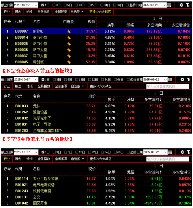 从板块资金动向数据来看,截止到今日收盘时,在资金流入榜上,元件板块以75.61亿的资金流入额位居榜首;其次是通信设备板块,资金流入64.76亿;此外,光学光电子板块、电子半导体板块、金属非金属新材料板块也都相继上榜,三个板块的资金流入额分别为57.77亿、37.15亿、30.01亿;再看资金流出榜,专业工程及装饰板块引领做空,资金流出2.41亿;其次是电气电源设备板块,资金流出2.04亿;此外,饮料低度酒板块、公交板块、园区开发板块的资金流出额也都相对较多,分列资金流出榜第三到第五名位置。综合比较后可知,今日不仅元件板块资金流入超过75亿,通信设备、光学光电子、电子半导体、金属非金属新材料等板块的资金流入额也都在30亿之上,资金进场依然积极,且热点仍主要集中在科技类板块,可持续的赚钱效应令场内多方人气进一步提升,全天资金流入超过10亿的板块多达27个;反观空方阵营,各板块的资金流出额均不足3亿,整体抛压很小。从六大战区的情况分别来看,截止到今日收盘时,六个战区均为资金流入状态,其中不仅创业板战区与深中大盘战区资金流入双双超过170亿,沪中大盘战区的资金流入额更是高达287亿。可见今日多方全面发力,各战区均有资金持续进场加仓,投资者的做多热情丝毫不减,大盘向着4000点整数关口逐步迈进。在这种氛围下,空方在短期内恐很难组织起大规模反击,接下来行情有望站上4000点,并继续向上攀升。建议大家跟随资金步伐,积极优选个股,择机介入。
