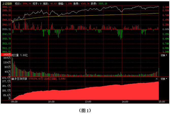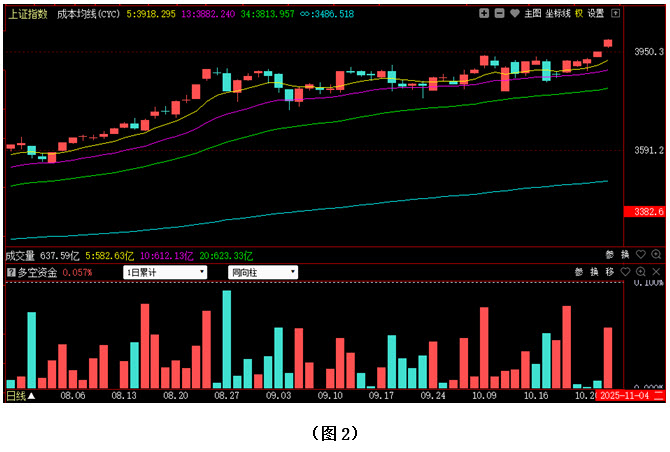 如图1所示,今日早间大盘高开,并继续上攻,指数很快就触及到3990点,随后尽管市场出现震荡,但向下回探的幅度很小,午后大盘绝大部分时间都运行在3990点上方,盘中更是一度摸至3999点,与4000点整数大关仅一点只差,然而多方还是将悬念留到了明日,指数最终以3996点收盘。从下方的多空资金来看,早间开盘后,多方就占据优势,随后资金持续流入。可见今日虽然大盘最终未能站到4000点上方,但资金进场十分坚决,空方毫无反击之力,说明目前投资者普遍对后市较为乐观。在这种氛围下,明日行情很有可能会摸高至4000点上方,但能否站稳,还需做进一步观察。建议大家不要盲目追涨,可关注前期调整较为充分且近期有资金连续回流的个股,逢低介入。