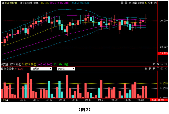 今日两市上涨个股共3361只,其中涨幅超过3%的个股628只,涨幅在9.9%以上的个股87只;下跌个股共1862只,其中跌幅超过3%的个股189只,跌幅在9.9%以上的个股15只。图3所示为指南针特有的0Z指数K线图,从图中可以看到,今日0Z指数开盘在优化布林上紫线上方,并继续小幅上扬,最终收出一根小阳线,收盘位置则上移至优化布林上轨附近,但0Z指数的优化布林敞口依然没有出现明显发散。可见今日场内多数中小盘个股都有持续上扬动作,但涨幅大多较小,所以市场整体上还是运行在自8月26日以来的震荡区间内部,尚未出现明确的向上突破动作。从下方的多空资金来看,今日0Z指数的多空资金为流入状态,且资金流入量与上周五基本持平,有利于后市继续向上攀升。在这种情况下,如果大盘站上4000点后能够进一步激发起投资者的追涨热情,市场整体走势就有望向上形成突破。建议大家在控制好仓位的同时,密切关注多空资金的进出情况,若多方后续无力,0Z指数在8月26日以来的震荡区间上沿附近遇阻,后市则仍会有再次下探可能。