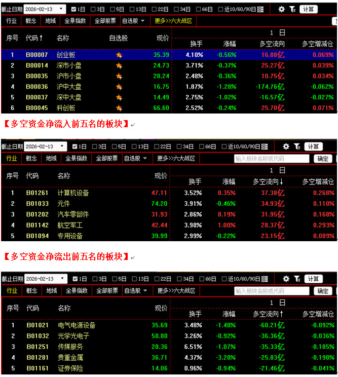 从板块资金动向数据来看,截止到今日收盘时,在资金流入榜上,计算机设备板块以37.38亿的资金流入额位居榜首;其次是元件板块,资金流入34.93亿;此外,汽车零部件板块、航空军工板块、专用设备板块的资金流入额也都相对较多,分列资金流入榜第三到第五名位置;再看资金流出榜,电气电源设备板块引领做空,资金流出60.21亿;其次是光学光电子板块,资金流出36.36亿;此外,传媒服务板块、贵重金属板块、证券保险板块也都相继上榜,三个板块的资金流出额分别为35.33亿、25.83亿、21.46亿。综合比较后可知,今日不仅电气电源设备板块资金流出超过60亿,同时光学光电子、传媒服务、贵重金属、证券保险等板块的资金流出额也均在20亿之上;好在多方并没有完全退缩,除计算机设备、元件、汽车零部件等板块的资金流入额均超过30亿之外,航空军工、专用设备等板块也积极跟进,所以场内整体做多人气并未出现大幅下降。从六大战区的情况分别来看,沪中大盘战区与深中大盘战区均为资金流出状态,且沪中大盘战区资金流出高达174亿;其余四个战区均为资金流入,其中深市小盘战区与科创板战区资金流入双双超过25亿。可见今日虽然多数战区仍保持着资金流入,但整体上资金却是以流出为主,空方力量强于多方,说明由于为了回避春节长假期间消息面上的不确定性,有部分资金选择了离场观望,从而导致行情出现回落。在这种情况下,如果春节长假期间消息面上较为平静,这些在今日流出的资金很可能会在节后选择重新进场,从而成为推动大盘继续向上攀升的动力。