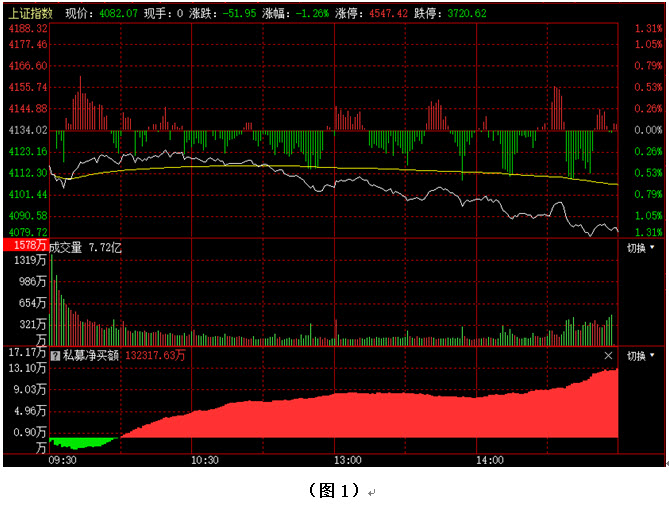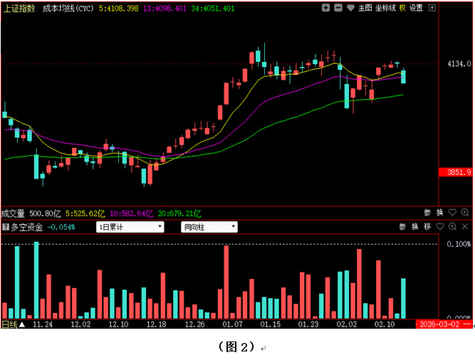 如图1所示,今日早间大盘低开并快速下探至4110点下方,虽然市场在4100点附近获得支撑,并出现反弹,但反弹力度明显偏弱,以致指数刚刚回升到4120点附近就遇阻回落,午后大盘更是跌破4100点整数关口,并出现持续下探,指数最终以4082点收盘。从下方的多空资金来看,早间开盘后,多方率先占据优势,但资金进场的持续性不强,且随着大盘不断下探,场内抛压越来越大,导致资金在午后出现由红翻绿,并持续流出。可见今日空方力量明显强于多方,指数再度回落至4100点下方。在这种情况下,节后多方能否及时予以反击将是决定市场短期走势的关键。建议大家在控制好仓位的同时,密切关注节后多空资金的进出情况,若多方资金连续回流,快速化解短线抛压,后市很可能会继续震荡上行;反之,如果多方无力反击,空方连续施压,则不排除大盘有再次考验4000点整数关口的可能。