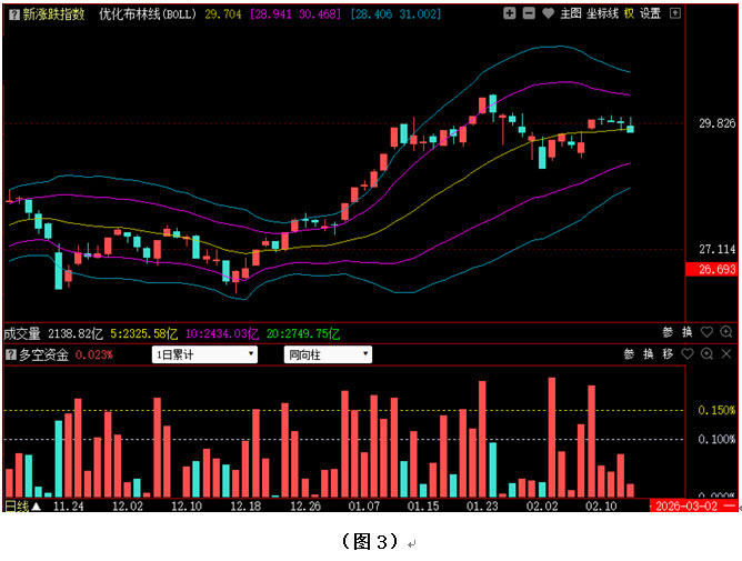 今日两市上涨个股共1430只,其中涨幅超过3%的个股234只,涨幅在9.9%以上的个股38只;下跌个股共3653只,其中跌幅超过3%的个股477只,跌幅在9.9%以上的个股17只。图3所示为指南针特有的0Z指数K线图,从图中可以看到,今日0Z指数同样收出阴线,并跌至优化布林中轨下方。可见今日场内多数个股都出现了回落,市场整体走势出现转弱迹象,好在0Z指数下跌幅度并不是很大,最终只是小幅收阴,所以只要多方及时发力,市场就有再度转强的可能。从下方的多空资金来看,今日多空资金为流入状态,虽然资金流入量较昨日减少,但显然还是有很多个股保持着资金流入状态,这就说明市场短期主动权依然掌握在多方手中,后市行情仍有向上震荡攀升的可能。
