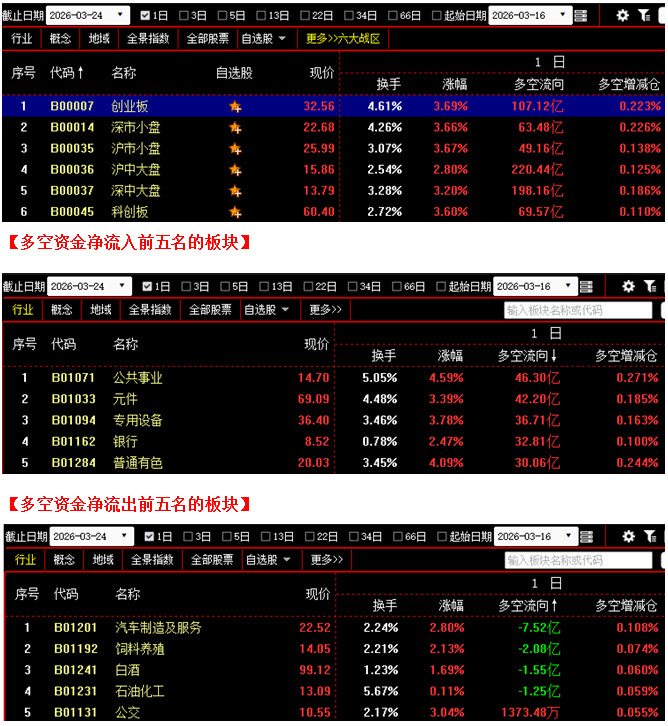 从板块资金动向数据来看,截止到今日收盘时,在资金流入榜上,公共事业板块以46.30亿的资金流入额位居榜首;其次是元件板块,资金流入42.20亿;此外,专用设备板块、银行板块、普通有色板块也都相继上榜,三个板块的资金流入额分别为36.71亿、32.81亿、30.06亿;再看资金流出榜,汽车制造及服务板块引领做空,资金流出7.52亿;其次是饲料养殖板块,资金流出2.08亿;此外,白酒板块、石油化工板块的资金流出额也都相对较多,分列资金流出榜第三与第四名位置。综合比较后可知,今日不仅公共事业板块与元件板块资金流入双双超过40亿,专用设备、银行、普通有色等板块的资金流入额也都在30亿之上,场内多方人气明显回升,全天资金流入超过10亿的板块多达26个;反观空方阵营,全天只有四个板块为资金流出状态,且各板块的资金流出额均不足8亿,整体抛压很小。从六大战区的情况分别来看,截止到今日收盘时,六个战区均为资金流入状态,其中不仅创业板战区资金流入超过百亿,沪中大盘战区与深中大盘战区的资金流入额更是均在190亿之上。可见今日多方全面反击,且与午评数据相比不难发现,创业板战区、科创板战区在午后也都相继发力。由于这些战区中聚集了大量的前期人气较高的科技类个股,所以当资金向这些战区中大幅回流时,多方人气更容易被重新激活,有利于后市进一步向上反弹。建议大家在控制好仓位的同时,关注有资金大幅回流且股价快速收复昨日失地的个股,择机介入。