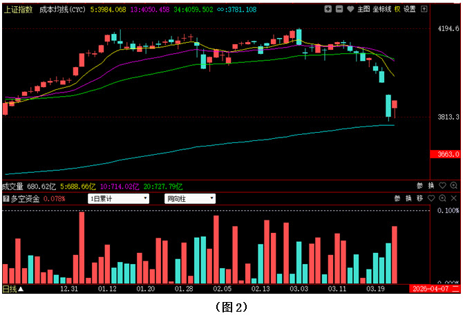 再看图2,今日大盘高开,并向上反弹,最终以阳线报收。从收盘位置看,虽然昨日的阴线实体已被吞没了大半,但指数依然远远低于5日成本均线,所以市场短期弱势格局尚未改变。目前5日成本均线正在快速下移,一旦反弹受到压制该线压制,指数无法向上形成突破,大盘就会有出现反复的可能。从下方的多空资金来看,今日多空资金为流入状态,且资金流入量超过了昨日的资金流出量,说明今日多方反击力度较大,但若是与前面连续几日的资金流出总量相比,显然市场中的短期抛压还没有被完全化解。在这种情况下,同样需要多方后续力量不断跟上,否则一旦空方再度施压,大盘就会有向下考验无穷成本均线支撑的可能。建议大家控制好仓位,不要急于重仓追涨,可关注之前在市场回落过程中有资金率先回流且短期走势重新转强的个股,逢低逐步吸纳。