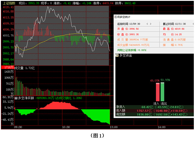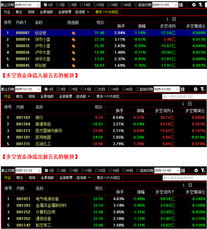 从板块资金动向数据来看,截止到今日午间收盘时,在资金流入榜上,银行板块以30.14亿的资金流入额位居榜首;其次是普通有色板块,资金流入24.78亿;此外,医疗器械与服务板块、家用电器板块、石油化工板块的资金流入额也都相对较多,分列资金流入榜第三到第五名位置;再看资金流出榜,电气电源设备板块引领做空,资金流出68.58亿;其次是金属非金属新材料板块,资金流出23.03亿;此外,计算机应用板块、通信设备板块、航空军工板块也都相继上榜,三个板块的资金流出额分别为22.99亿、21.86亿、16.62亿。综合比较后可知,今日上午虽然银行板块资金流入超过30亿,同时普通有色、家用电器、石油化工等权重板块纷纷出现在资金流入榜前列,但由于其他板块跟进做多的力度普遍较弱,所以权重板块的发力只能对大盘起到一定支撑作用,却无法引领市场连续上攻;反观空方阵营,不仅电气电源设备板块资金流出高达68亿,金属非金属新材料、计算机应用、通信设备等板块的资金流出额也都在20亿之上,对场内多方人气形成明显压制。可见今日上午多方虽试图拉动权重板块来推动大盘上攻,但由于缺乏其他板块的配合,效果并不理想。而近期较为活跃的电气电源设备、计算机应用、通信设备等板块抛压明显增大,对投资者的做多信心造成一定打击。在这种情况下,后市行情很可能还会有所反复。建议大家控制好仓位,同时密切关注场内多空资金的进出情况以及4000点整数关口的得失情况,如果多方后续力量能够不断跟上,市场连续多日站稳在4000点上方,后市就有望进一步向上攀升;反之,若是多方后续力量不足,大盘回探到4000点下方之后无力向上回升,后市行情则很可能还会出现继续下探的动作。
