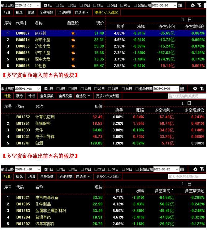 从板块资金动向数据来看,截止到今日收盘时,在资金流入榜上,计算机应用板块以67.40亿的资金流入额位居榜首;其次是传媒服务板块,资金流入58.74亿;此外,元件板块、电子半导体板块、白酒板块也都相继上榜,三个板块的资金流入额分别为34.23亿、33.20亿、5.71亿;再看资金流出榜,电气电源设备板块引领做空,资金流出64.58亿;其次是化学制品板块,资金流出50.67亿;此外,金属非金属新材料板块、普通有色板块、汽车零部件板块的资金流出额也都相对较多,分列资金流出榜第三到第五名位置。综合比较后可知,今日虽然计算机应用板块资金流入高达67亿,同时传媒服务、元件、电子半导体等板块的资金流入额也都在30亿之上,但其它板块并未积极跟进做多,所以主力通过拉动科技类板块来维持场内多方人气的目的并没有达到;反观空方阵营,不仅电气电源设备板块资金流出超过60亿,化学制品、金属非金属新材料、普通有色等板块的资金流出额也都在47亿之上,全天资金流出超过10亿的板块更是多达23个,整体抛压明显加大。从六大战区的情况分别来看,截止到今日收盘时,只有科创板战区为资金流入状态,资金流入额19亿;其余五个战区则均为资金流出,其中不仅深中大盘战区资金流出超过170亿,沪中大盘战区的资金流出额更是高达252亿。可见今日空方力量在整体上远远强于多方,说明随着大盘持续下探,投资者对后市的预期正在出现转变,场内的恐慌性抛盘快速增多。在这种情况下,如果多方无法及时阻止恐慌情绪的蔓延,空方的抛压还会不断增强,最终导致市场出现加速下行。建议大家在控制好仓位的同时,密切关注场内多空资金的进出情况,若多方迟迟无法发力反击,操作上则需多加谨慎,切不可急于重仓抄底。