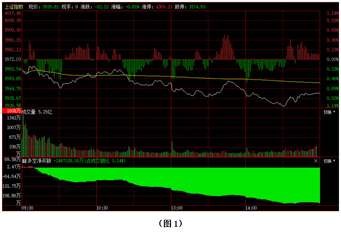 如图1所示,今日早间大盘低开并继续下探,虽然市场在3944点附近时遇到支撑,随后有所反弹,但反弹的力度明显偏弱,以致指数刚刚回升到3960点附近就再次调头向下,午后大盘更是快速跌破早间低点,并继续震荡下行,最终以3939点收盘。从下方的多空资金来看,早间开盘后,多方率先占据优势,但资金进场力度明显不足,于是空方趁机施压,资金很快出现翻绿,并不断流出。可见今日多方在盘中虽也曾试图向上反击,但资金进场力度始终偏弱,导致反弹难以持续。而反弹的多次失败更是令场内多方人气越来越低,大盘只得继续向下寻求支撑。在这种情况下,不排除短期内市场或有回探3900点整数关口的可能。建议大家控制仓位,谨慎对待。