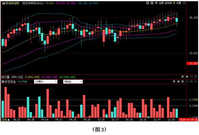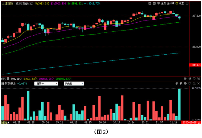 再看图2,今日大盘延续了前两日的下探走势,指数跌破13日成本均线,市场短期走势进一步转弱。从下方的多空资金来看,今日多空资金为流出状态,且资金流出量较昨日大幅增加,说明随着大盘连续三天下挫,5日成本均线与13日成本均线接连失守,场内的恐慌性抛盘开始明显增多。在这种情况下,行情很可能会出现进一步下探。目前34日成本均线已上移至3890点上方,接下来如果大盘继续下探,将有可能在3900点附近遇到34日成本均线与3900点整数关口构成的双重支撑,从而出现反弹,所以没有及时减仓的投资者此时不必盲目杀跌,可先等待反弹出现,再进行仓位调整。不过需要注意的是,若是反弹时多方资金回流力度不足,这种反弹将只是下跌过程中的一个短暂中继,后市或有更深幅度的调整。建议大家控制好仓位,同时密切关注场内多空资金的进出情况,以便及时掌握行情变化,并做出相应决策。