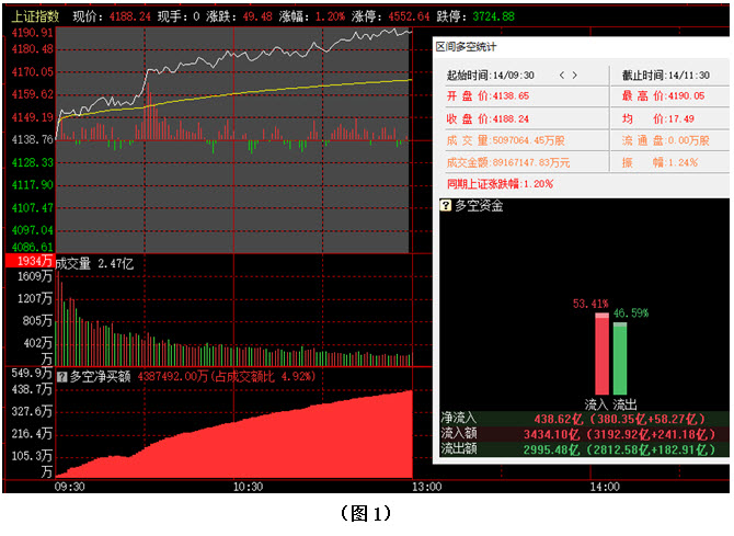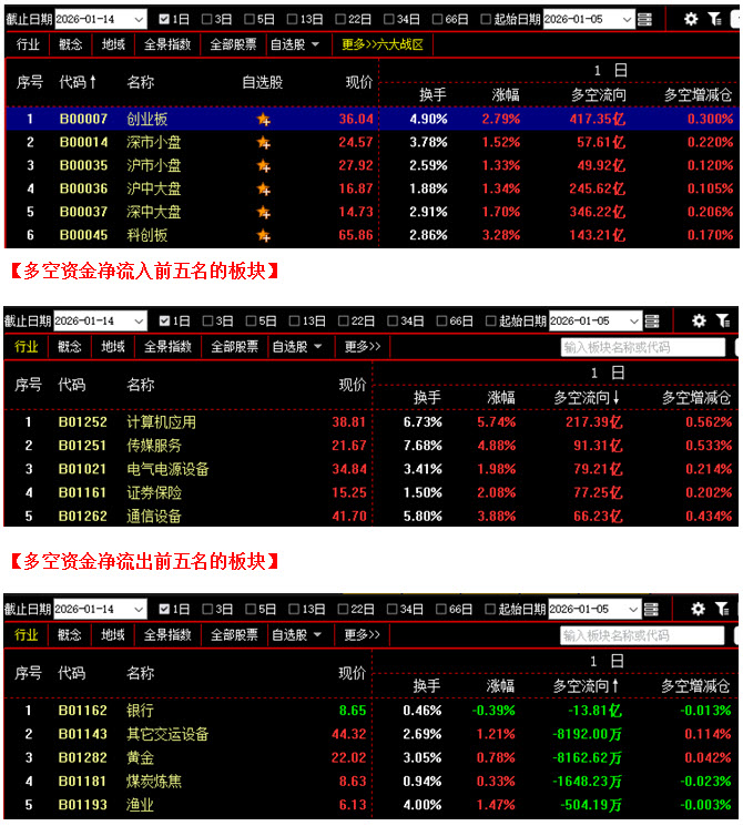 从板块资金动向数据来看,截止到今日午间收盘时,在资金流入榜上,计算机应用板块以217.39亿的资金流入额位居榜首;其次是传媒服务板块,资金流入91.31亿;此外,电气电源设备板块、证券保险板块、通信设备板块也都相继上榜,三个板块的资金流入额分别为79.21亿、77.25亿、66.23亿;再看资金流出榜,银行板块引领做空,资金流出13.81亿;其次是其它交运设备板块,资金流出0.81亿;此外,黄金板块、煤炭炼焦板块、渔业板块的资金流出额也都相对较多,分列资金流出榜第三到第五名位置。综合比较后可知,今日上午不仅计算机应用板块资金流入高达217亿,传媒服务、电气电源设备、证券保险、通信设备等板块的资金流入额也都在65亿之上,近期热点板块再度获得资金集体大幅增仓,场内多方人气快速提升,仅半天时间,资金流入超过10亿的板块就多达26个;反观空方阵营,只有银行板块资金流出高于10亿,其余板块的资金流出额均不足亿元,整体抛压很小。可见今日上午资金抢筹迹象十分明显,多方力量远远强于空方,说明在当前位置,主力不仅没有离场,反而在进一步加仓做多。在这种情况下,行情自然难以出现连续大幅杀跌,后市则有望在资金的推动下继续向上攀升。建议大家关注近期有资金连续加仓且短期趋势保持向上的个股,逢低吸纳。