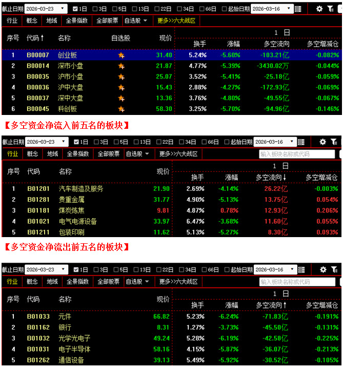 从板块资金动向数据来看,截止到今日收盘时,在资金流入榜上,汽车制造及服务板块以26.22亿的资金流入额位居榜首;其次是贵重金属板块,资金流入13.75亿;此外,煤炭炼焦板块、电气电源设备板块、包装印刷板块的资金流入额也都相对较多,分列资金流入榜第三到第五名位置;再看资金流出榜,元件板块引领做空,资金流出71.83亿;其次是银行板块,资金流出45.50亿;此外,电子半导体板块、光学光电子板块、通信设备板块也都相继上榜,三个板块的资金流出额分别为42.58亿、36.07亿、30.52亿。综合比较后可知,今日不仅元件板块资金流出高达71亿,电子半导体、光学光电子、通信设备等科技类板块的资金流出额也都在30亿之上,从而形成群体杀跌效应,导致恐慌性抛盘不断增多,场内多方人气快速下降,与此同时,银行板块也有资金大幅流出,更是加剧了大盘回落的速度;反观多方阵营,虽然汽车制造及服务、贵重金属、煤炭炼焦、电气电源设备等板块资金流入均超过10亿,但其中只有煤炭炼焦一个板块是处于上涨当中,说明即便有一些板块迎来了资金回流,可是仍无法阻挡板块整体向下回落的步伐。从六大战区的情况分别来看,截止到今日收盘时,六个战区均为资金流出状态,其中不仅创业板战区与科创板战区资金流出双双超过90亿,沪中大盘战区的资金流出额更是高达172亿。可见今日空方全面施压,恐慌性抛盘明显增多,导致各战区的下跌幅度都在4%之上,市场整体走势明显偏弱。这种情况下,行情在短期内或仍有惯性下探的可能,但由于下跌速度过快,反弹的能量也在不断积累,所以惯性下探结束之后,一旦多方发力反击,很多个股将有望迎来报复性反弹。建议大家在控制好仓位的同时,关注前期有资金积极流入且股价先于大盘企稳回升的个股,并跟踪观察,待市场出现反弹信号后,及时介入。