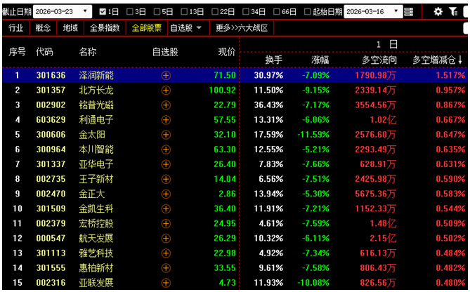 【今日多空资金增仓前200名中涨幅最小的15只个股】