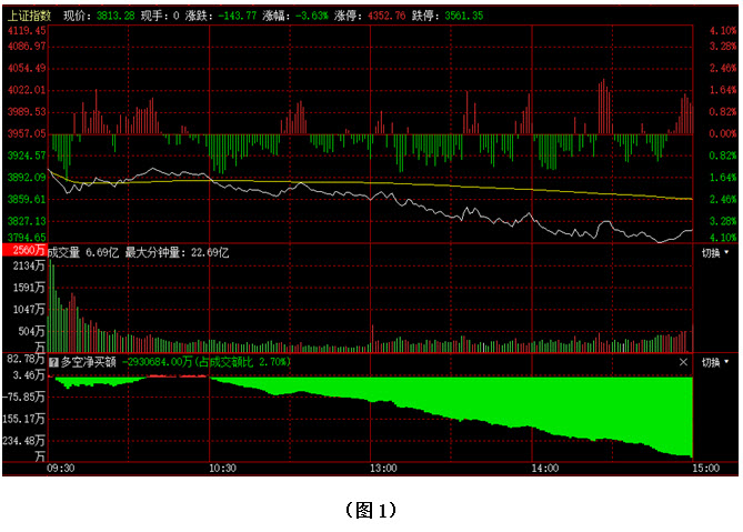 如图1所示,今日早间大盘大幅低开50多点,并快速击穿3900点整数关口,盘中多方虽曾试图反击,但力度明显不足,以致指数刚刚回升至3900点附近就再度遇阻,市场只得重新跌落至3900点整数关口下方,并继续向下寻求支撑,午后大盘走势依然十分低迷,指数甚至一度跌破3800点,好在尾盘略有反弹,最终以3813点收盘。从下方的多空资金来看,早间开盘后,多方率先占据优势,但资金进场力度很弱,所以空方稍一施压,资金就会由红翻绿,午后多方基本放弃抵抗,随着大盘持续下滑,恐慌性抛盘更是不断增多。可见今日空方力量远远强于多方,具备着压倒性优势。在这种情况下,多方很难快速组织起有力反击,所以按照以往经验,在空方力量尚未出现明显衰减之前,冒然进场抄底往往会抄在下跌途中。建议大家控制好仓位,谨慎操作。