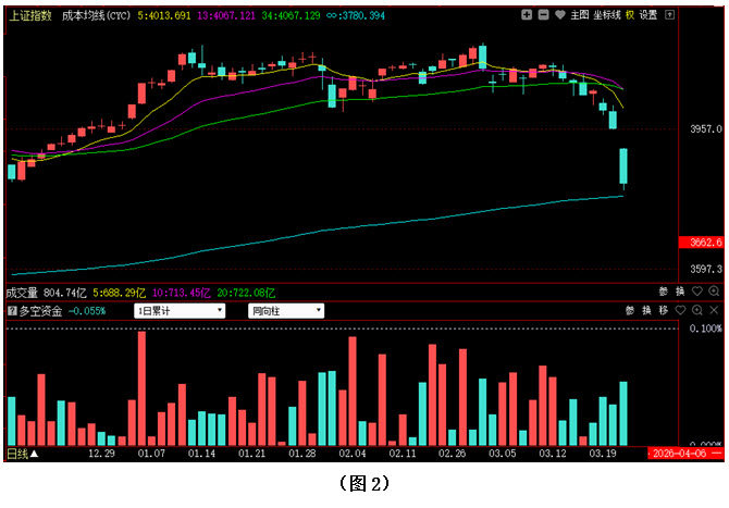 再看图2,今日大盘低开低走,大幅收阴。指数不仅轻松跌破3900点整数关口,而且上方的13日成本均线也快速下移,并与34日成本均线形成死叉,可见市场短期弱势格局十分明显,行情仍处在加速下探过程当中,底部位置尚不明朗。从下方的多空资金来看,今日多空资金仍为流出状态,且资金流出量较上周五明显放大,说明由于大盘连续杀跌,导致投资者持股信心出现动摇,恐慌性抛盘越来越多。不过需要注意的是,由于近期大盘下跌速度过快,目前指数已偏离5日成本均线多达200点,行情本身已具备较强的反弹要求;而今日的收盘点位不仅已极为接近无穷成本均线,而且与2025年11月24日和2025年12月16日的两次低点也几乎处在同一水平线上,意味着这处应具备一定支撑。内有反弹要求,外有支撑条件,所以一旦多方发力反击,反弹随时可能出现。在这种情况下,建议大家在控制好仓位的同时,可提前优选好目标个股,跟踪观察,一旦行情在3800点一带企稳,且多方资金快速回流,则可及时抄底,博取反弹收益。