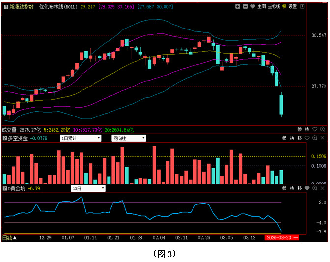 今日两市上涨个股共291只,其中涨幅超过3%的个股124只,涨幅在9.9%以上的个股34只;下跌个股共4886只,其中跌幅超过3%的个股4360只,跌幅在9.9%以上的个股127只。图3所示为指南针特有的0Z指数K线图,从图中可以看到,今日0Z指数低开低走,全天都运行在优化布林下轨下方,最终收出一根跌幅超过5%的长阴线。可见今日场内多数个股都出现了大幅杀跌,市场加速探底迹象十分明显。从下方的多空资金来看,今天多空资金仍为流出状态,且资金流出量大于上周五,说明空方动能尚未出现持续衰减,在这种情况下,行情就仍有继续下探的可能。不过需要注意的是,由于加速探底,目前0Z指数的收盘位置已远远偏离优化布林下轨,且截止到今日收盘时,D黄金坑指标中的蓝线也已快速下移至-6.79的位置,若接下来继续下移,达到-7.8以下,就会出现黄金坑超跌信号。故此尚未离场的投资者此时切不可盲目杀跌,以免割肉割在地板上,反而可趁机积极优选个股,做好进场准备。