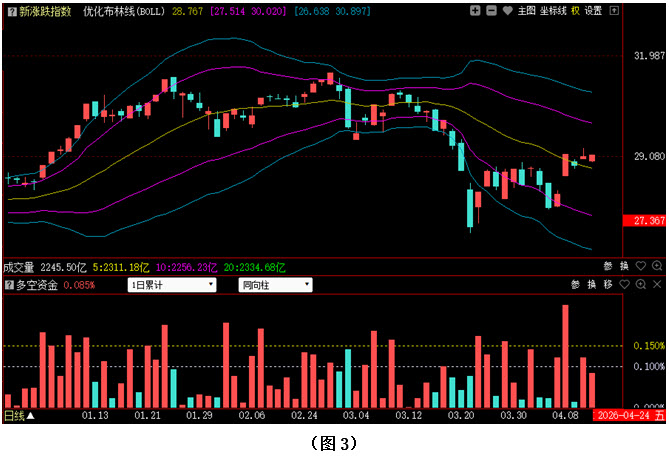今日两市上涨个股共2317只,其中涨幅超过3%的个股513只,涨幅在9.9%以上的个股76只;下跌个股共2720只,其中跌幅超过3%的个股287只,跌幅在9.9%以上的个股12只。图3所示为指南针特有的0Z指数K线图,从图中可以看到,今日0Z指数同样低开后出现回升,最终小幅收阳,收盘位置依然位于优化布林中轨上方。可见今日场内多数个股涨跌幅不大,市场整体基本处于原地踏步的状态。从下方的多空资金来看,今天多空资金为流入状态,但资金流入量较上周五有所减少,说明尽管多方在连续发力,但资金的进场力度有减弱迹象。在上周五的晚评中我们曾经提到,0Z指数2月2日的低点与3月4日的低点几乎处在同一水平线上,3月19日跌破该位置后,意味着上方筹码均已被套。目前这条水平线就在0Z指数上方不远处,若多方无法连续发力,将很难快速穿越前期的套牢筹码区,届时一旦空方趁机施压,行情就会再次出现反复。