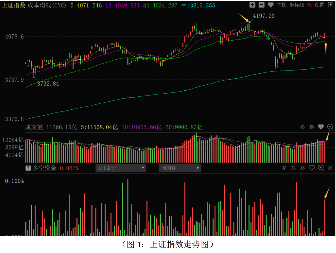 消息面,美联储维持联邦利率不变,并未给出明确降息时间表,高利率或维持一短时间,总体上符合市场预期。短期美元走势偏强,对北向资金流向短期或有一定的影响。同时,据新华社报道,美国总统特朗普29日凌晨在社交媒体上发文称:“伊朗就是搞不明白,他们不知道怎么签署无核协议。他们最好快些放聪明点!”特朗普还配发一张图片,图片上是他持枪的“造型”,配有文字“不再有好好先生”,相关再度增加中东局势的不稳定性,导致国际油价大涨,短期资金避险情绪会有升温,也加大节前市场的波动。从上证指数来看,昨日股指一改节前资金观望的态度,出现强势上涨的行情。主要原因,是中央政治局会议对经济发展的全面部署,并且明确提出“稳定和增强资本市场信心”的定调,进一步稳固市场信心和夯实5日成本均线和4000点一带的支撑力度。会议对人工智能、算力网、新型电网、地产、猪肉等行业的政策强化,催化相关板块的活跃,激发资金的做多积极性,相关板块资金活跃的同时外溢至部分科技制造、新能源等板块上,资金做多积极性得到政策的支持和再度聚拢,资金持股过节的意愿增强,推动市场整体上涨。短期股指强势上涨站上4100点整数大关,中短期成本均线处于多头排列状态,短期股指走势总体强势。不过,今日是“五一”假期前最后一个交易日,市场短期大涨之后,技术上依然面临前期高点和筹码密集峰的压力,上方有一定的解套盘抛压,叠加中东局势尚未明朗和国际油价的大涨,加大假期期间的不确定性,资金避险情绪会有提升,追涨积极性或有犹豫。由于政策定调相对积极,今天年报、一季报业绩风险最后释放阶段,短期资金大举离场的概率不高,预计股指会维持强势震荡的走势。技术上,5日成本均线一带短线有较强支撑,前期高点和筹码密集峰位置有较强的压力(4130—4200点)。在高层会议政策部署和业绩风险释放之后,行情能否对震荡走势形成突破,外部环境密切关注中东局势能否有积极的消息落地,以及5月中旬特朗普访问中国行程的敲定情况;内部因素关注后续地产和消费政策推进的力度和节奏。从0Z指数走势来看,股指围绕中、短期成本均线连续震荡后,再度强势上涨,全市场上涨个股家数明显多于下跌个股家数,多空资金净流入1256.67亿元,主力资金再度大幅流入。不过,短期资金大幅释放之后,由于假期的临近和前期高点的压力,市场面临一定的获利盘和解套盘的抛压,节前最后一个交易日盘中仍有震荡的可能,股指或有震荡确认中短期成本均线黏合处的需求。节前操作上应采取稳健策略应对,总仓位控制在5成左右,底仓持股为主;短线仓位多看少动,节后根据行情走势和政策消息面顺势操作,持仓短线品种应趁反弹根据关键位置资金流向和短线决策信号做好仓位调整。