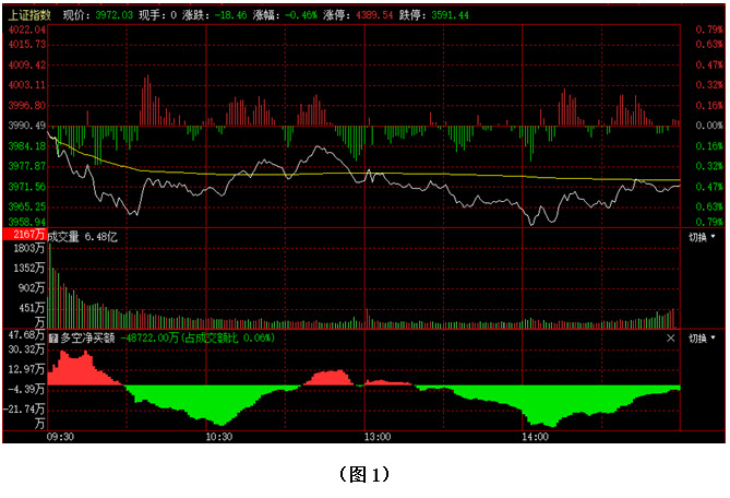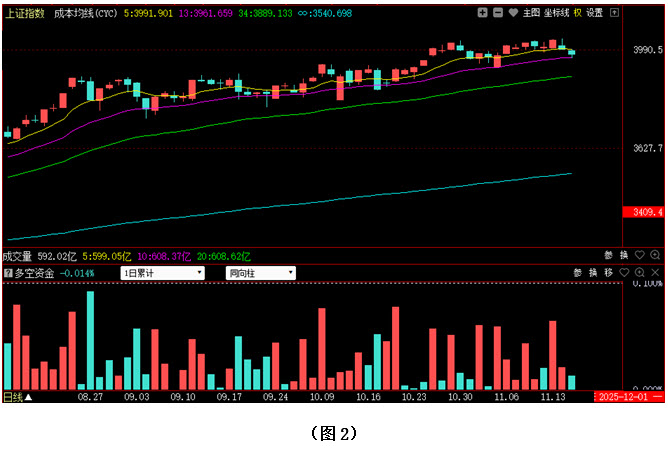 如图1所示,今日早间开盘后,大盘就出现一波连续下探,盘中一度跌至3960点附近,随后市场虽有反弹,但由于力度较弱,指数刚刚回升到3980点附近就无法继续上攻,午后大盘再次下探,并跌破早间低点,好在没有持续杀跌,尾盘时指数略有反弹,最终以3972点收盘。从下方的多空资金来看,早间开盘后,早间开盘后,多方率先占据优势,但盘中多空反复争夺,资金时而翻红,时而翻绿。可见今日多方虽有向上反击动作,但资金进场力度始终偏弱,以致大盘无法形成持续性反弹,场内多方人气难以大幅提升。在这种情况下,短期内空方很可能还会继续施压,市场或有进一步下探的动作。建议大家控制仓位,做好防御准备。