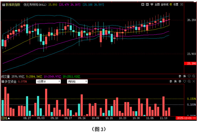 今日两市上涨个股共2584只,其中涨幅超过3%的个股514只,涨幅在9.9%以上的个股106只;下跌个股共2726只,其中跌幅超过3%的个股337只,跌幅在9.9%以上的个股8只。图3所示为指南针特有的0Z指数K线图,从图中可以看到,今日0Z指数并未跟随大盘下跌,而是贴着优化布林上紫线小幅上涨,略有收阳,同时优化布林中轨也在持续上移。可见今日场内多数个股依然保持着逐步上行的状态,市场整体走势依然较强。从下方的多空资金来看,今日多空资金为流入状态,且资金流入量大于上周五,说明在当前位置,多数投资者对后市仍抱有较为乐观态度,所以大盘的回探并没有引发市场出现恐慌,反而有资金在逢低加仓。在这种情况下,只要多方继续发力,后市就仍有进一步向上拓展空间的可能。