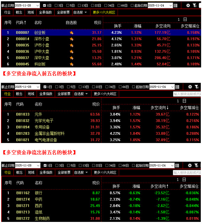 从板块资金动向数据来看,截止到今日收盘时,在资金流入榜上,元件板块以39.67亿的资金流入额位居榜首;其次是光学光电子板块,资金流入38.19亿;此外,专用设备、金属非金属新材料板块、电气电源设备板块也都相继上榜,三个板块的资金流入额分别为35.32亿、33.88亿、32.89亿;再看资金流出榜,银行板块引领做空,资金流出23.52亿;其次是中药板块,资金流出7.16亿;此外,西药板块、造纸板块、生物制药板块的资金流出额也都相对较多,分列资金流出榜第三到第五名位置。综合比较后可知,今日不仅元件板块资金流入接近40亿,光学光电子、专用设备、金属非金属新材料、电气电源设备等板块的资金流入额也都在32亿之上,场内热点不断,多方人气继续维持在较高水平,全天资金流入超过10亿的板块多达22个;反观空方阵营,虽然银行板块资金流出超过20亿,对大盘形成一定压制作用,但其余板块的资金流出额均不足8亿,整体抛压相对较小。从六大战区的情况分别来看,截止到今日收盘时,六个战区均为资金流入状态,其中不仅创业板战区与沪中大盘战区资金流入双双超过130亿,深中大盘战区的资金流入额更是高达206亿。可见今日多方仍在全面发力,各战区均有资金连续大幅回流,说明尽管大盘连续几日徘徊不前,但投资者的做多热情却并未因此出现丝毫下降。在这种情况下,场内的多方动能就会不断累积,不仅可以逐渐夯实市场下方基础,而且还会为行情再次挑战3900点整数关口蓄积能量,届时一旦指数向上形成有效突破,大盘将有望迎来加速回升。建议大家在控制好仓位的同时,可关注近期有资金连续加仓且股价短期走势重新转强的优质个股,逢低吸纳。