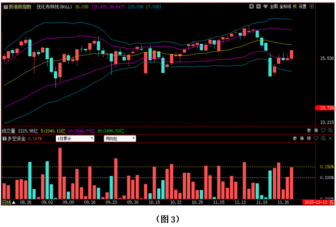 再看图2,今日大盘小幅上涨,收出阳线,但收盘位置仍处于34日成本均线下方,同时5日成本均线也已下移至3900点之下,与34日成本均线对指数形成双重压制,可见市场短期走势依然偏弱。不过从下方的多空资金来看,今日多空资金依然为流入状态,且资金流入量进一步放大,说明目前仍有场外资金在连续进场加仓,且力度越来越强。这就意味着,尽管目前大盘从K线形态上看似十分危险,上方压力重重,难以突破,但多方人气却丝毫没有涣散,做多动能还在不断蓄积。在这种情况下,将不排除指数有突然大幅拉升、一举突破上方多条成本均线压制的可能。建议大家控制好仓位,同时密切关注多方双方在3900点附近的争夺情况,若指数轻松突破并站稳3900点整数关口,行情在年末就有再冲4000点的可能。